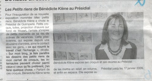 « Les Petits Riens ». Galerie du Présidial. Quimperlé. 2008 Publié le 29/12/2011 par benedicteklene Télégramme. 17 Novembre 2008 Ouest France. Novembre 2008