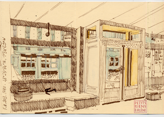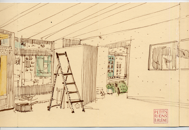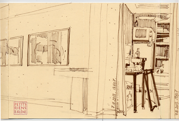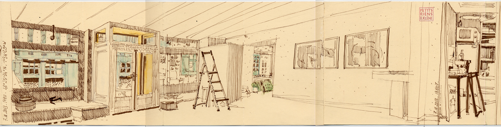 Un autre accrochage en cours au Village, site d’expérimentation artistique de Bazouges la Pérouse. En cet après midi encore pluvieux, en attendant l’artiste, Vincent Victor Jouffe, j’ai un peu de temps pour croquer l’espace de la galerie Laizé et j’en profite pour commencer un Petit Rien….