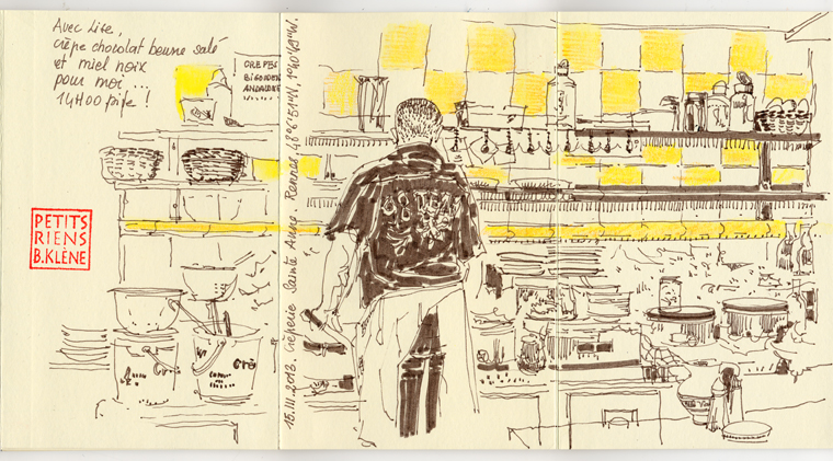 Lise (de son vrai nom) a eu la bonne idée d’aller dans cette crêperie bien connue ici où l’on fait les galettes et les crèpes devant vous, à l’ancienne. J’ai commencé avec le dessert et Lise a pris la suite au café…. et j’en ai profité pour tirer son portrait.