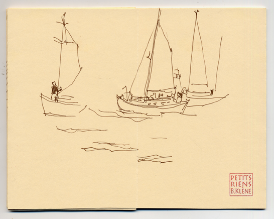 Le samedi, au départ de la première course, il y avait un bon force 5 à 6 qui soulevait aussi bien la mer que les estomacs et les coeurs. Aussi mes chroniques croquées se sont limitées à la sortie de la rade de Port Louis, lorsque les bateaux rejoignaient la ligne de départ.