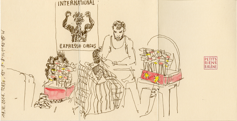 14. VI. 2014. 12H30. 48° 9′ 8 »N 1°40′ 45 » W Publié le 21/06/2014 par benedicteklene Préparatifs : Le spectacle commence bientôt ! Expresso Circus, du théâtre du Nombr-Île, c’est du rêve, de l’imaginaire.. et des chamallows en plus pour mieux déguster le spectacle !