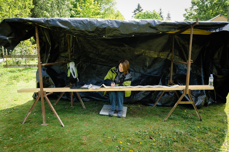 Bonheur de dessinateur : deux journées encore intenses , le plus souvent sous la pluie, au point que Michel m’installe un abri à dessin dans son pré. Un véritable affût à Petits Riens ! Yann Le Sacher dessine à quelques mètres de moi, protégé du déchaînement du ciel par un parasol transformé pour l’occasion en parapluie….