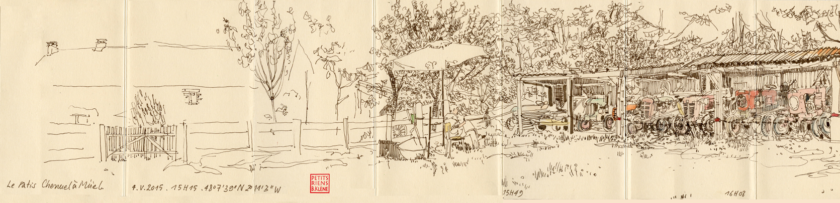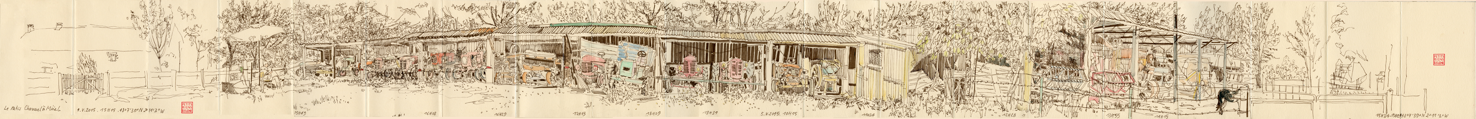 Finalement, mon dessin de Muël avait bien besoin d’atteindre les deux mètres de long pour croquer toutes les incroyables machines, tracteurs, moissonneuses batteuses et autres antiquités agricoles remisées ici !