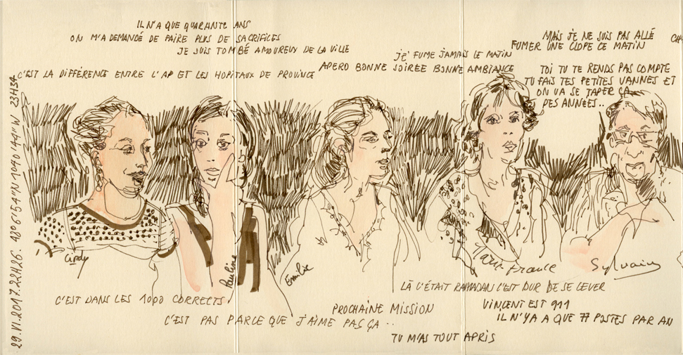 29. VI. 2017. 22H 26 – 23H 54. 48° 6′ 54 » N 1° 40’44 » W Publié le 01/07/2017 par benedicteklene Un petit dîner bien sympa au restau, c’est toujours une bonne occasion de faire le portrait des convives..