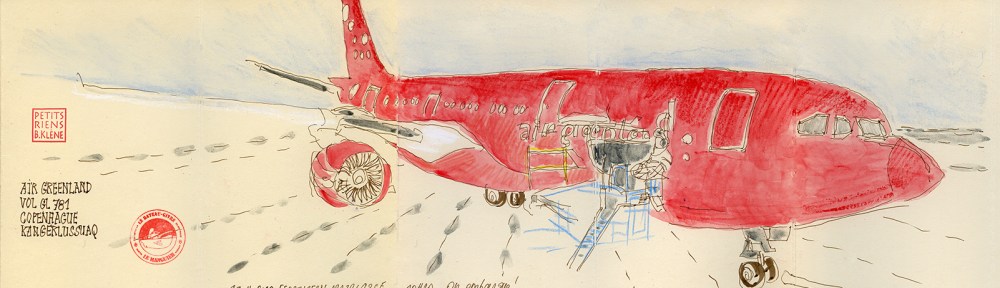 Je sais que, depuis mon retour, vous êtes nombreux à attendre des nouvelles de mes Petits Riens. Comme cela fait juste deux mois aujourd’hui que je m’envolais vers le Groenland dans le bel avion rouge d’Air Greenland, je voudrais profiter de cette date anniversaire symbolique pour commencer à partager mes dessins avec vous tous, amis ou inconnus qui vous intéressez à cette aventure, qui me soutiennent et m’accompagnent depuis le début de ce magnifique projet des Petits Riens en Arctique. Alors, commençons doucement depuis le début…