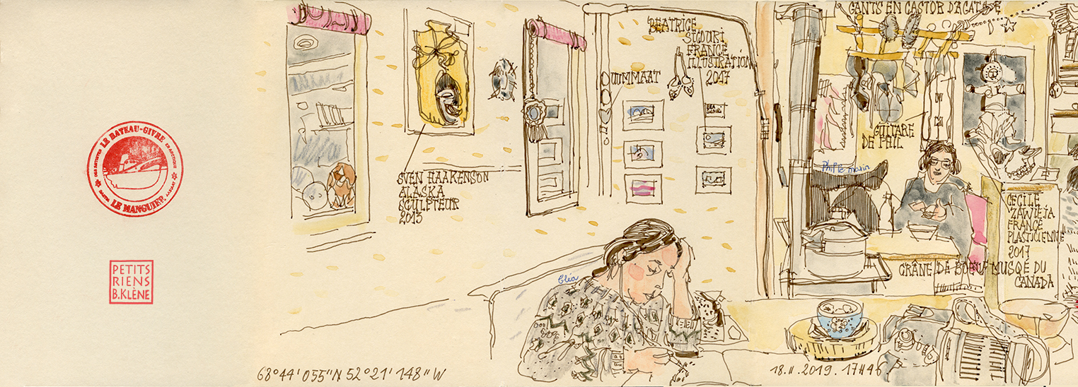 Dans la douceur des soirs et la quiétude de notre abri arctique, improbable château nautique posé au milieu des glaces, Cléa dessine, Cécile modèle, Phil lit, Roxane et Oïjha chantent, Eric regarde ses images d’arpenteur. Et moi je dessine..