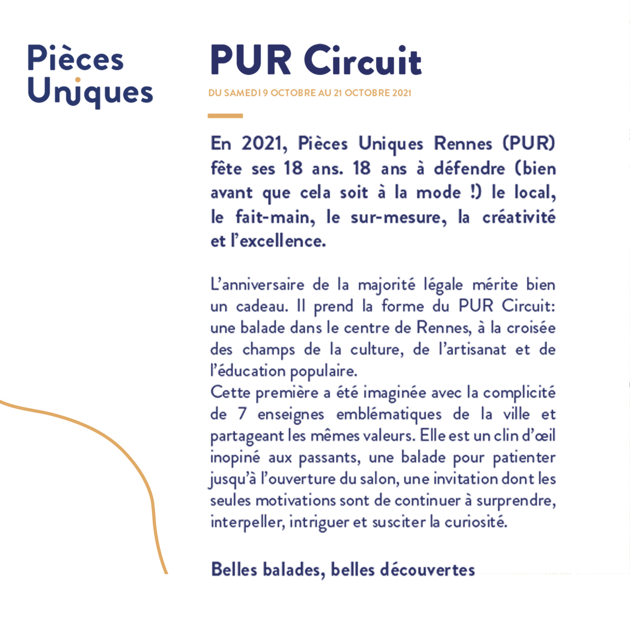 Circuit PUR : Lydia Belghitar (émaillage sur lave), Jonathan Bernard (sculpteur), Mélanie Bourget (sculpteur céramiste), Morgane Chouin (artiste graveur), Armelle Daumezon (empreintes végétales sur matières naturelles), Nathalie Ecotiere (modiste), Marie Farber (reliure d’art et façonnage papier), Michele Forest (mode et bisous contemporains), Alexandra Guignard (gravure), Bénédicte Klène (artiste plasticienne, chroni-croqueuse) Sophie Latron (artisan d’art), Uli Rossbach (ébéniste), Caroline Salles (mosaïste), Elodie Tanguy (céramiste)