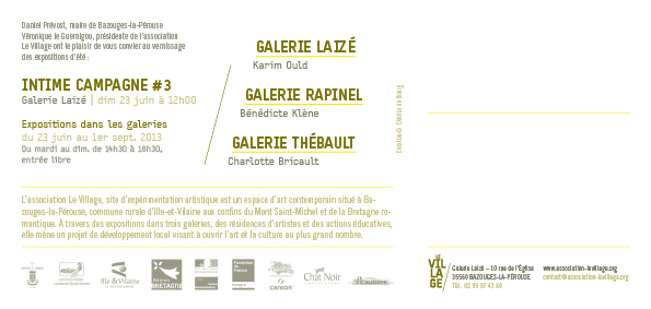 Le Village-site d’expérimentation artistique / Galerie Rapinel. 35560 Bazouges la Pérouse. Ouvert du mardi au dimanche. 14h30-18h30. Entrée Libre.
