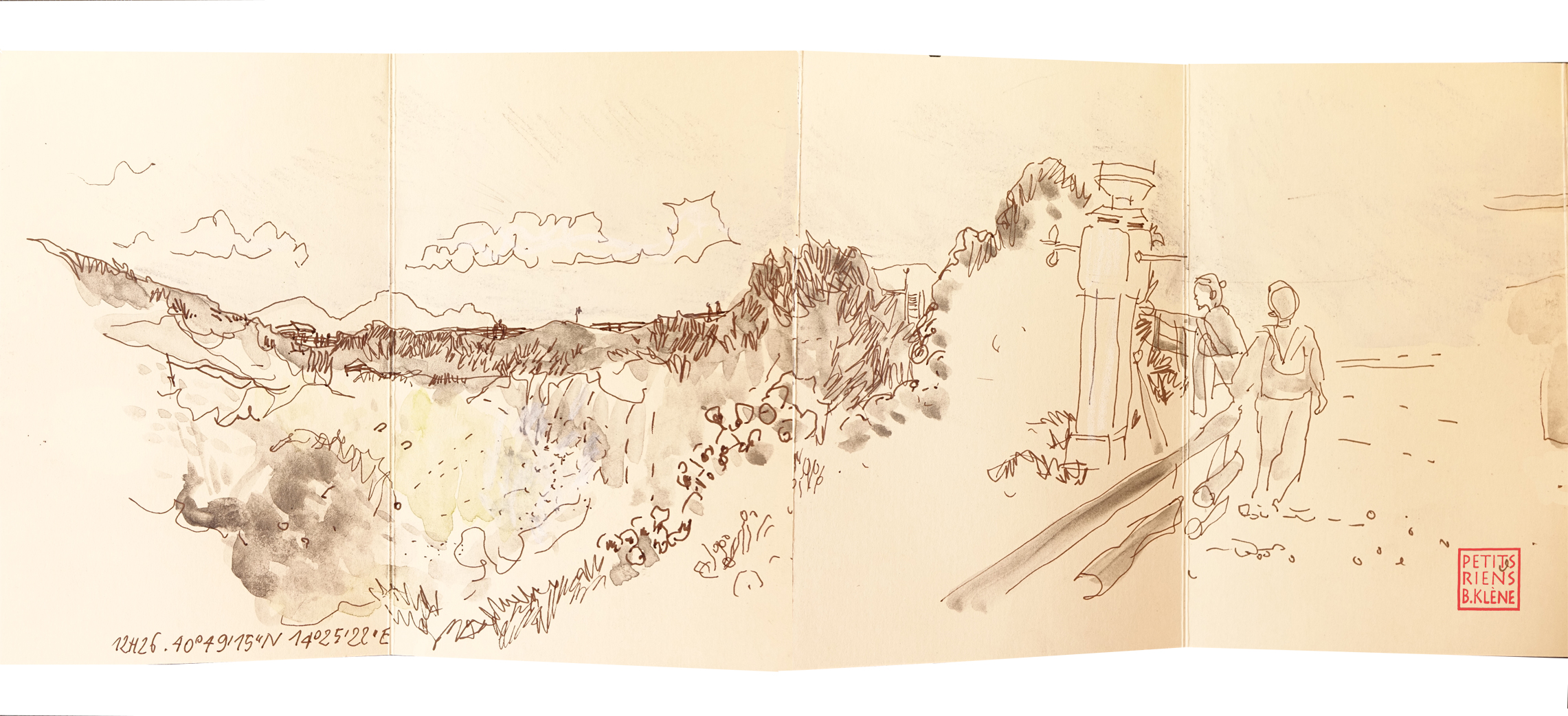 Le chemin se poursuit sur le bord du cratère, révélant progressivement le panorama sur le golfe et ses îles, de Naples à Sorrente. Antonia a préparé pour chacun de ses élèves un joli Leporello de papier blanc. Ils m’attendent , déjà installés sur de grandes couvertures qui les protègent de la poussière. C’est la pause- dessin.