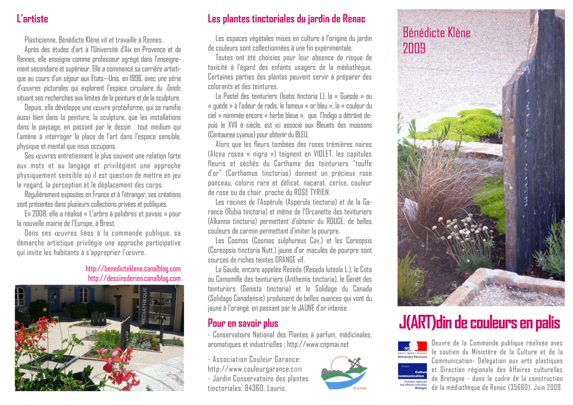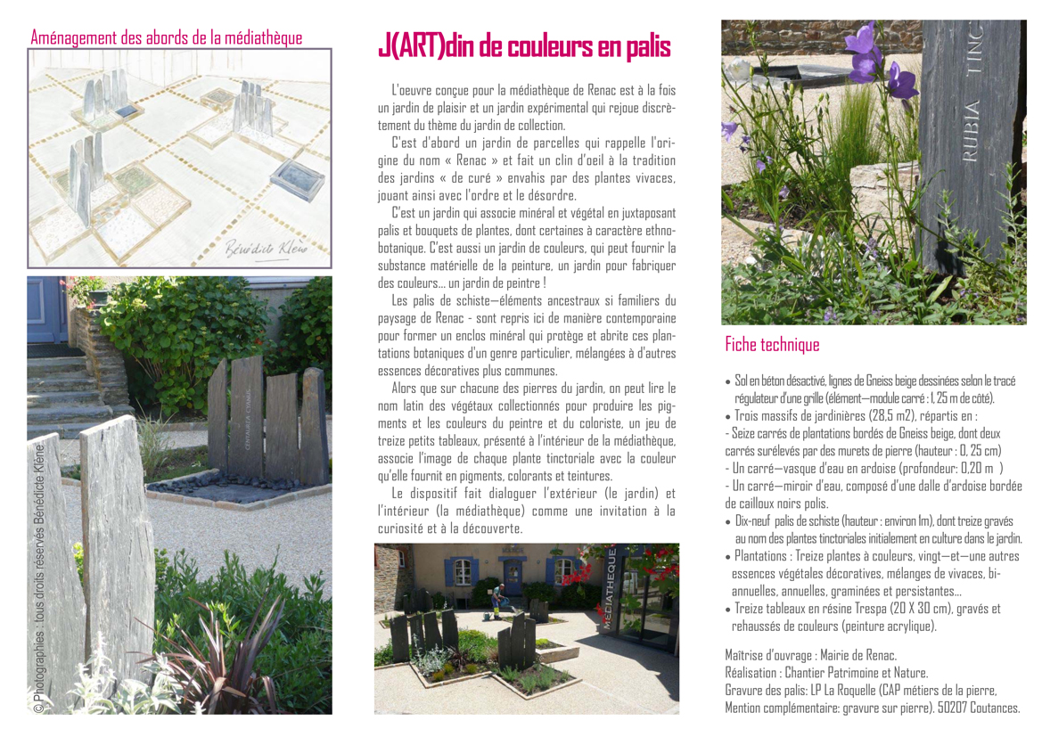 Les palis de schiste—éléments ancestraux si familiers du paysage de Renac – sont repris ici de manière contemporaine pour former un enclos minéral qui protège et abrite ces plantations botaniques d’un genre particulier, mélangées à d’autres essences décoratives plus communes. Alors que sur chacune des pierres du jardin, on peut lire le nom latin des végétaux collectionnés pour produire les pigments et les couleurs du peintre et du coloriste, un jeu de treize petits tableaux, présenté à l’intérieur de la médiathèque, associe l’image de chaque plante tinctoriale avec la couleur qu’elle fournit en pigments, colorants et teintures. Le dispositif fait dialoguer l’extérieur (le jardin) et l’intérieur (la médiathèque) comme une invitation à la curiosité et à la découverte.