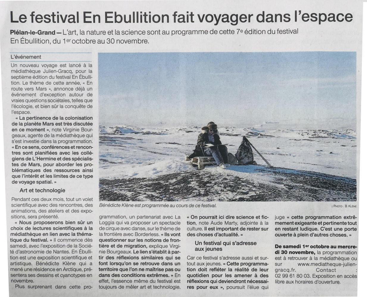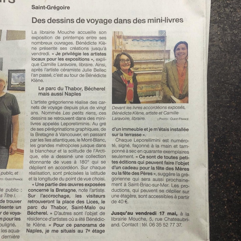 MEDIA / 2021 – 2025 Ouest -France24/03/25 Ouest France 24/03/2025Article de Sabine Huet Ouest -France13/05/25 Ouest France 13/05/2024 Des dessins de voyage dans des mini-livres La Montagne / Correze23/03/24 Article de Blandine Hutin dans LA MONTAGNE CORREZE / » Embarquement pour un voyage dans le temps et l’espace au Centre d’art contemporain de Meymac » Ouest France20/09/23 Ouest France2O septembre 2023Portes Ouvertes à l’atelier des Petits Riens Ouest France 7/09/23 Ouest France7 septembre 2023« Carnets d’artistes ». Galerie La Boulange56 Guidel Fondation TaylorLauréats Prix Taylor Prix 2021Article de Nicole LamotheCritique d’art Ouest-France27/09/22 Exposition Plélan le Grand Les infos15/11/22 ArtensionMagazine07-08/23 ARTENSION MagazineNuméro spécial CARNETS DE VOYAGES Juillet-Aout 2023 Unidivers 24/09/21 EXPO. LES PETITS RIENS DE BENEDICTE KLENE S’EXPOSENT À MÉDRÉACArticle d’Emmanuelle Volage FR3 Bretagne8/10/21 SUPPLEMENT D’ART . Interview par Eric Pinault Ouest france8/10/ 21 Ouest France. 8 octobre 2021 L’Hebdo d’Armor10/ 21 Lire la suite: MEDIA / 2021 – 2025 Lire la suite: MEDIA / 2021 – 2025