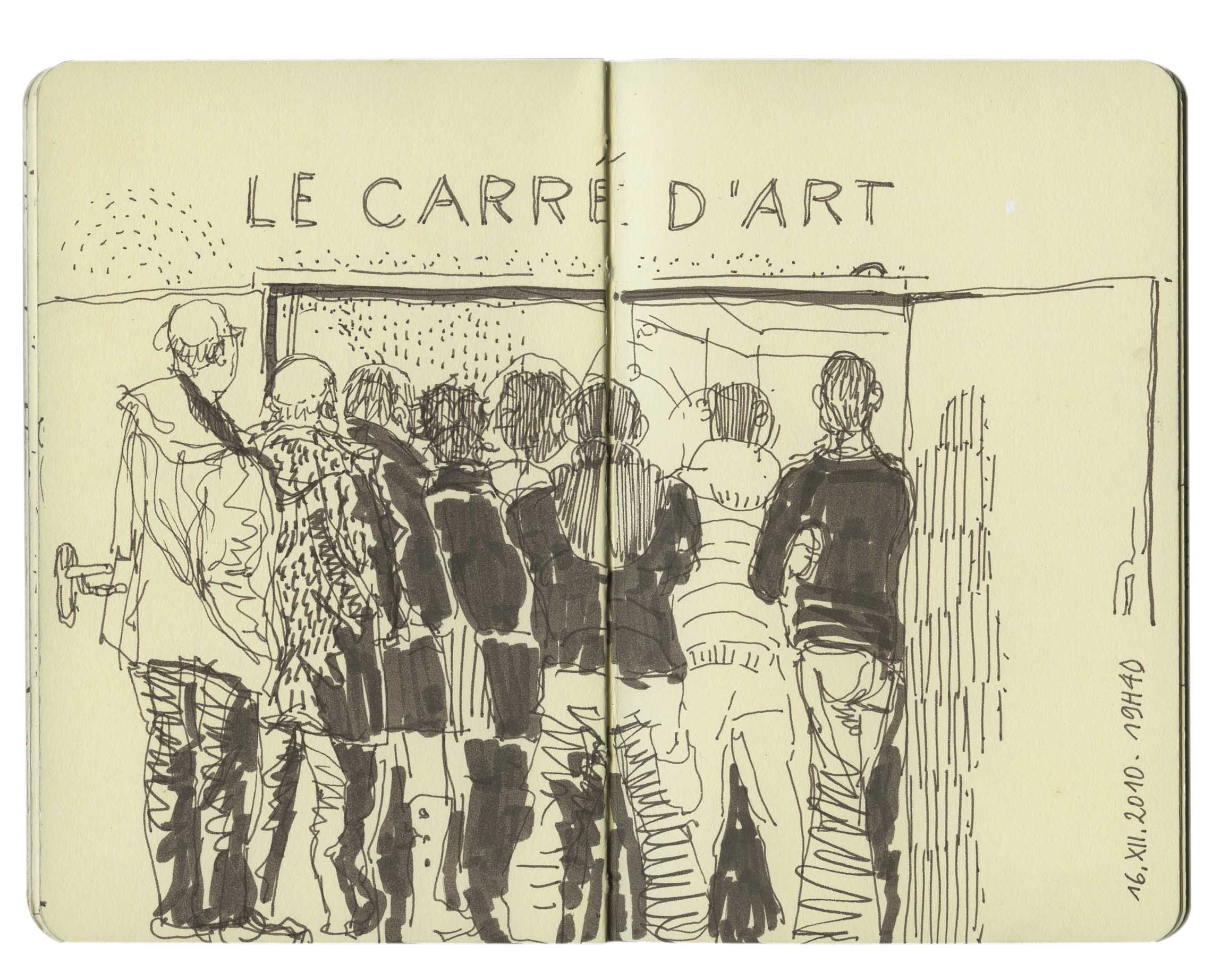 – Dessiner sur le vif, tout simplement et directement, à l’encre de chine sépia, sans m’autoriser ni reprise, ni retouche à posteriori, ni même intervention de la gomme.