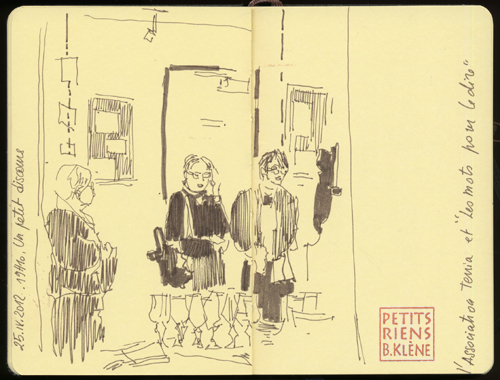 Publié dans 2012. Escale au Pôle Sud, Chroniques croquées | Mots-clefs : Association Les Mots pour le dire, Association Teria, Bénédicte Klène, carnet de voyage, Centre culturel Chartres de Bretagne, Chartres de Bretagne, Chroniques croquées, Chronos, dessin contemporain, discours chanson et vernissage, Ernest Aïppah, espace mediatheque, Journal de bord, les petits riens, Résidence d'artiste, Résidence d'artiste au Pôle Sud, Reportage dessiné, Vanités | Laisser une réponse