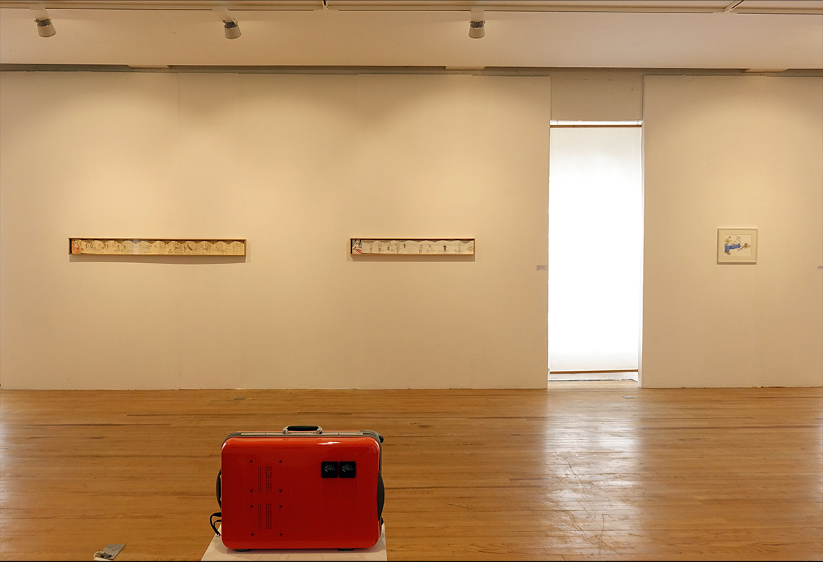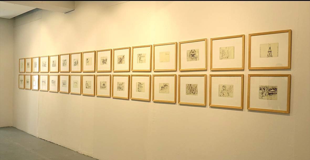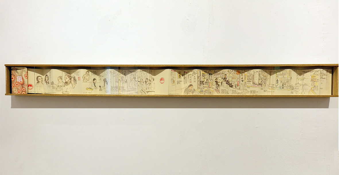 4 dessins sur papier crème, 21 volets encadrés, 17,6 x 7 x 180 cm