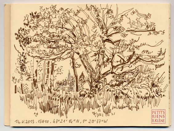 En empruntant le GR, j’aperçois le village de Chauvigné ( 744 habitants), au dessus d’un affleurement de granit et sous les branches d’un vieux noyer. Heureusement pour moi, il n’y avait pas d’animaux dans le champ à côté du chemin, alors j’ai pu installer le vieux petit pliant de pêche sur lequel j’aime m’asseoir pour dessiner . Et pour la première fois, j’ai testé le croquis sous cape imperméable de vélo ! Pas très pratique pour dessiner mais efficace pour abriter son carnet et le protéger de la pluie… Je connaissais l’expression « rire sous cape », maintenant, je dirais « dessiner sous cape »….