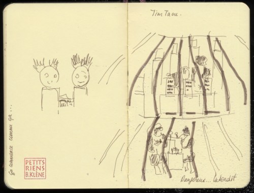De là haut, j’ai quand même un drôle de point de vue – inhabituel et surprenant- sur le spectacle qui se déroule en bas . J’aperçois les deux artistes, Marie Tuffin et Odile L’Hermitte, à travers les branches écorcées qui forment de la charpente. En revanche, le public m’est caché et c’est un peu dommage car j’aimerais bien voir les réactions sur le visage des adultes comme des enfants …