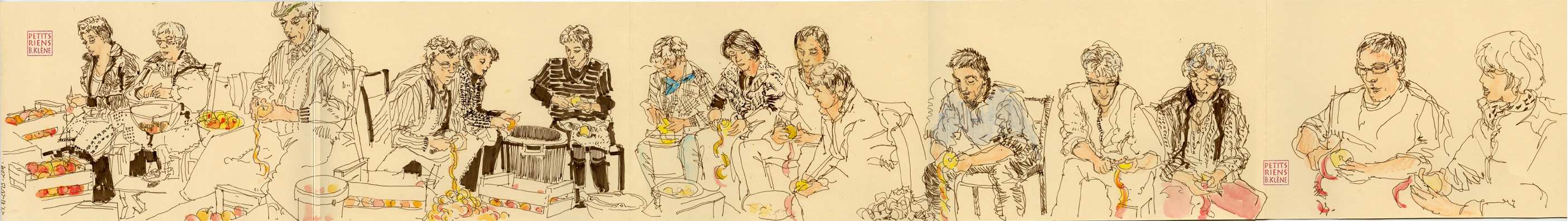 La soirée d’épluchage des pommes à Tremblay, avec Christelle L., Paulette L., Daniel L., Marie-Thérèse L., Sylvie B., Marie Claude L., Anne-Joëlle de S., Corinne I., Laurent G. et son fils, Lucas, Antony A., Marcelle B., Renée L., Laurent V., Alexandra G..