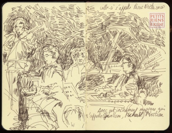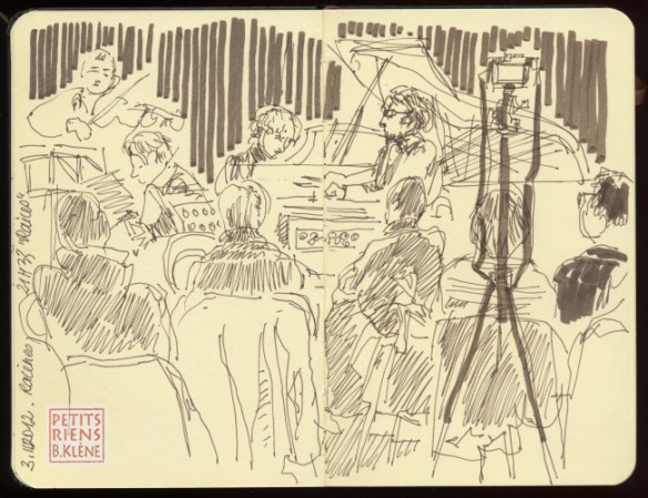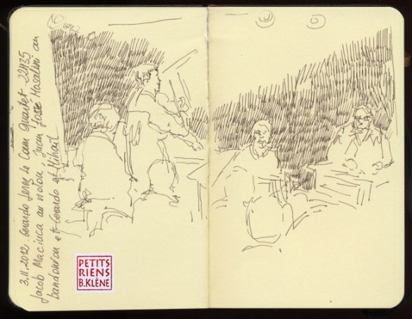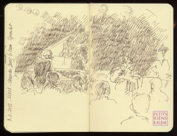 Publié dans 2012. Escale au Pôle Sud, Chroniques croquées | Mots-clefs : Bénédicte Klène, carnet de voyage, Centre culturel Chartres de Bretagne, Chartres de Bretagne, Chroniques croquées, Chronos, Concert, dessin contemporain, Gerardo Jerez Le Cam Quartet, Journal de bord, les petits riens, Musiques du monde, Pôle Sud, Résidence d'artiste, Résidence d'artiste au Pôle Sud, Reportage dessiné, Vanités | Laisser une réponse