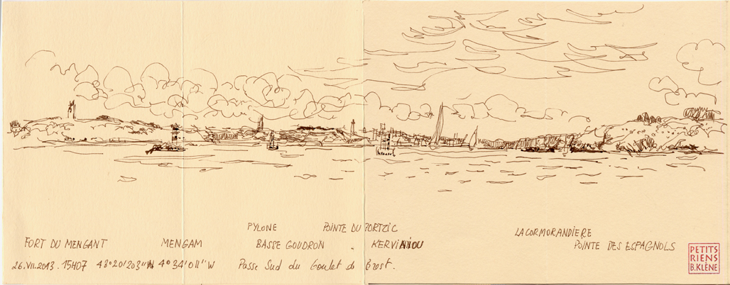 Cette fois, c’est le retour à Brest où un autre équipage nous attend pour faire la régate de la coupe des deux Phares avec Eloise II… Allez ! un dernier « Petit Rien » « pour la route », croqué rapidement sur le capot de descente alors que le bateau s’engage dans la passe Sud du goulet de Brest.