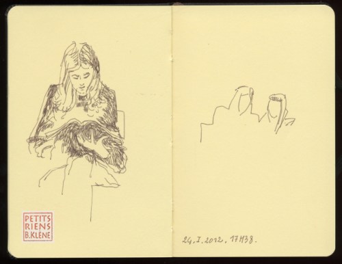 J’aime bien m’installer dans le monde feutré et serein des médiathèques et des bibliothèques pour observer les usagers de ces espaces. Ils sont toujours tellement absorbés par leurs lectures qu’ils ne me voient pas les dessiner…