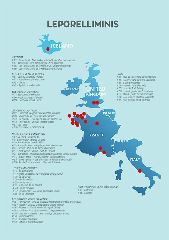 Soit 55 LEPORELLIMINIS, de la série des Panoramas des Petits Riens des Petits Bouts du Monde, tous numérotés et signés, pour vous inviter au voyage de la Bretagne jusqu’en Arctique, en passant par les grandes métropoles, ou encore les îles atlantiques..